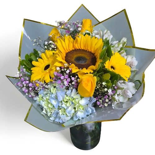 Un diseño vibrante que combina la energía de los girasoles y gerberas amarillas con la suavidad de las hortensias azules y acentos de astromelias. Es la combinación perfecta de frescura y color para iluminar cualquier habitación. ¡Haz tu pedido hoy y regala alegría!